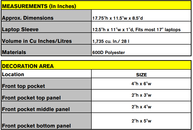 Laptop sleeve: 12.5"h x 11"w x 1"d, fits most 17" laptops